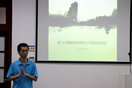 2015年6月14日下午3时,厦门大学国际关系学院暨南洋研究院2015年学长学姐就业分享会在南安楼107举行。分享会上李波、肖轺芳、徐斯雅、方成四位毕业生学长学姐轮流给大家分享了自己考公务员、银行实习、创业、找工作的故事,为南洋学子们提供一些就业路上的宝贵经验,使大家收获颇丰。