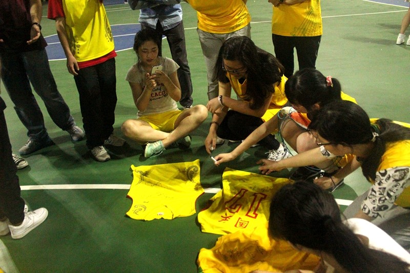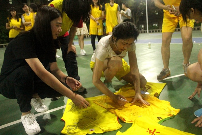 东苑篮球场上,女篮队员们不愿离去。国关女篮队员们在即将离队的2012级女篮成员队服上签名留念。签名后仔细写好的日期,或是名字后面画上的一颗心,都倾注着她们深厚的感情。