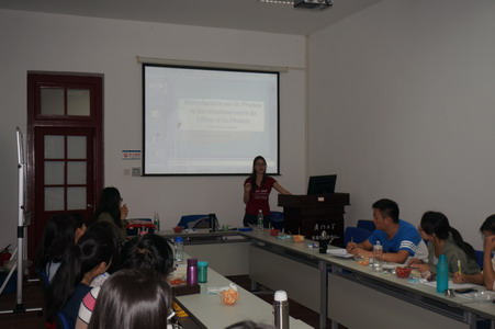 Ashleen为同学们做了第二场演讲,Ashleen中文名字——陆馨言,通晓中、法、英三国语言,本科专业是汉语与中国文化。今天主要为大家讲解了法国与中法关系的知识。关于法国,为大家讲述了法国的国旗和纹章,及其它们各自所代表的意义,谈到法国有16大区,101个省,还谈到为大家所陌生的海外省和海外地区,特意提到了马提尼克岛。关于中法关系,Ashleen着重讲解了戴高乐总统在位时期的中法关系,提到法国是新中国成立后与中国建交的欧洲第一国。还讲述了当今中国在世界上占有重要的地位,中法建交的50年里,在经济、科学、文学和艺术、学术和语言、环境和可持续发展等各个方面都有着深入的合作。最后还提到厦门与法国之间的渊源,谈到厦门是法国在中国投资的一个重要城市。