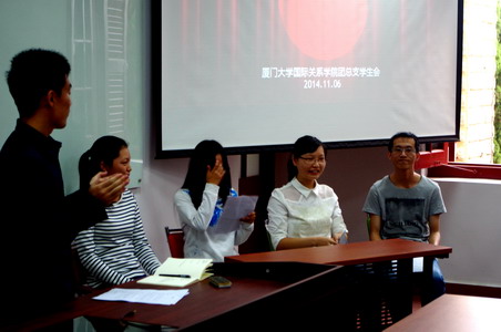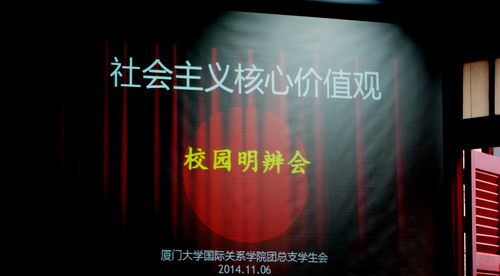 2014年11月6日下午4点30分,由厦门大学国际关系学院本科生团总支学生会举办的社会主义核心价值观校园明辨会在南安楼203正式举行。我院各年级学生代表出席活动。本次校园明辨会由两部分组成,其一是有关社会主义核心价值观的宣讲会,其二是有关我国社会现状的辩论会。我院13级本科生宋子豪同学主持了此次活动。