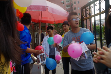 2014年11月11日早上六点,正如为男生节特别定制的海报上所写“让姑娘们给你温暖与陪伴,从黎明的早安到深夜的晚安”。为了道一句“早安”的惊喜,各个年级的女生迅速起床、洗漱,穿戴整齐后,拎上给男生的特别礼物——写有每个男生名字的气球以及精心准备的明信片、营养美味的爱心早餐前往男生宿舍。虽然2014级女生没能进入男生宿舍,但男生们接到早安电话后欣喜地下楼领取早餐,感受到的温暖丝毫不少。