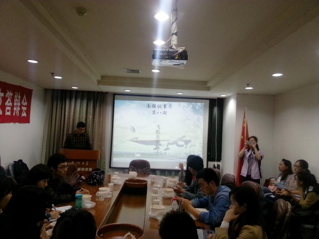 2014年4月1日晚7:00整,由厦门大学南洋研究院、人文学院、新闻传播学院和台湾研究院研究生会共同主办、南洋研究院承办的第八期南洋议事厅(硕博论坛)在颂恩楼1036会议室举行。此次硕博论坛主题为“飞机去哪儿了”,由南洋研究院2013级硕士张建康同学主持,吸引了30多位来自各院的硕士生和博士生前来交流。
