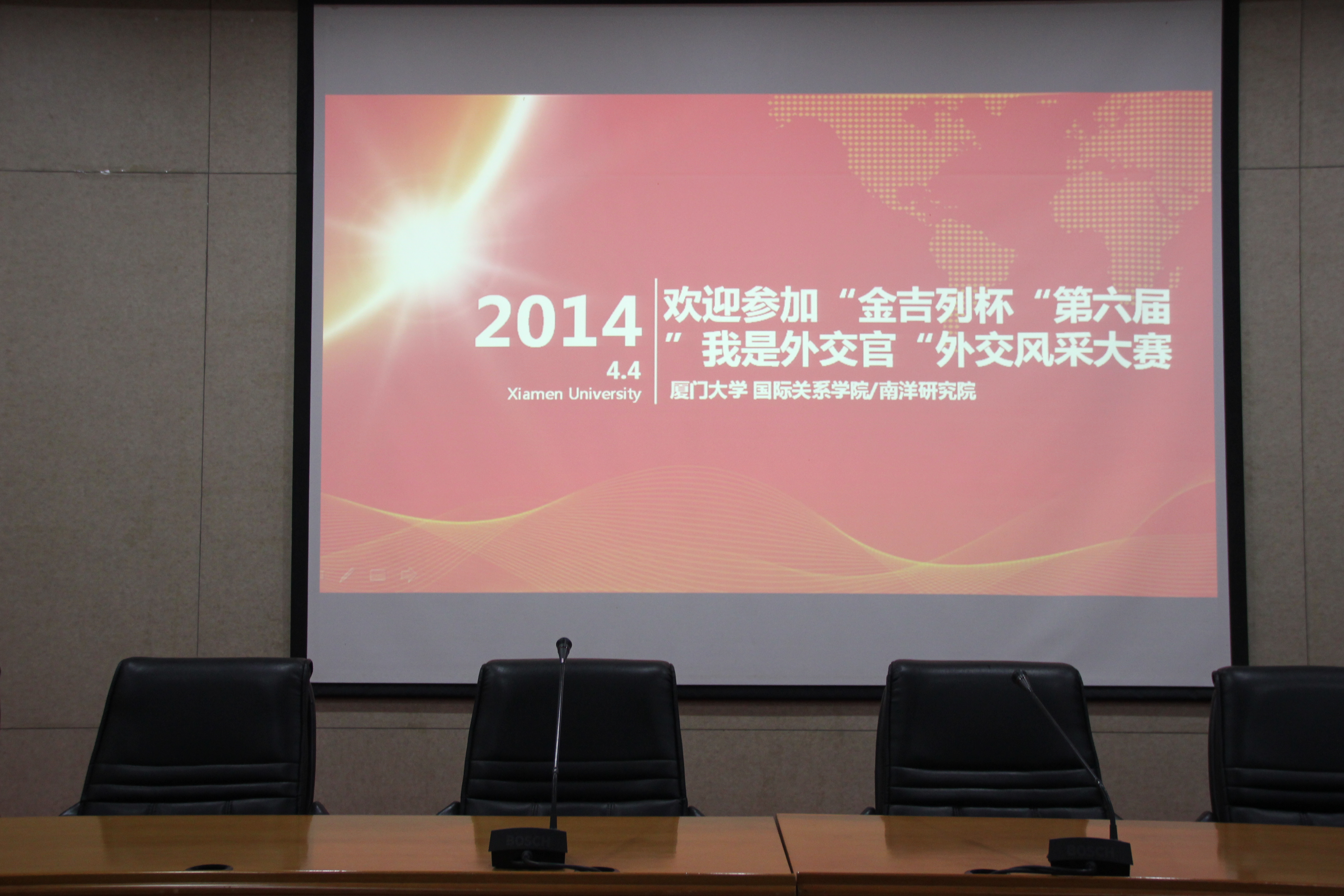 2014年4月4日晚7点,由共青团厦门大学委员会、国际关系学院暨南洋研究院主办的“金吉列杯”第六届厦门大学“我是外交官”外交风采大赛开幕式及讲座“理想的外交官”在厦门大学本部颂恩楼220会议室隆重举行。本次开幕式由李晓燕主持,国际关系学院暨南洋研究院博士、副教授方浩老师担任讲座主讲人。参加开幕式及讲座的有国际关系学院/南洋研究院副院长施雪琴、团委书记沈丽秀及来自各院系的近二百名同学参加了该活动