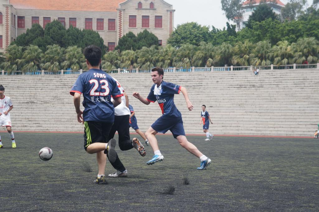 2014年4月14日中午12时40分,厦门大学2014年足球超级联赛A组小组赛在上弦场如期进行。对战双方为国际关系学院与人文学院,经过一个多小时的激战,国关在先失一球且最后20分钟少打一人的不利情况下,最终2:1逆转人文学院,夺得了揭幕战的胜利。