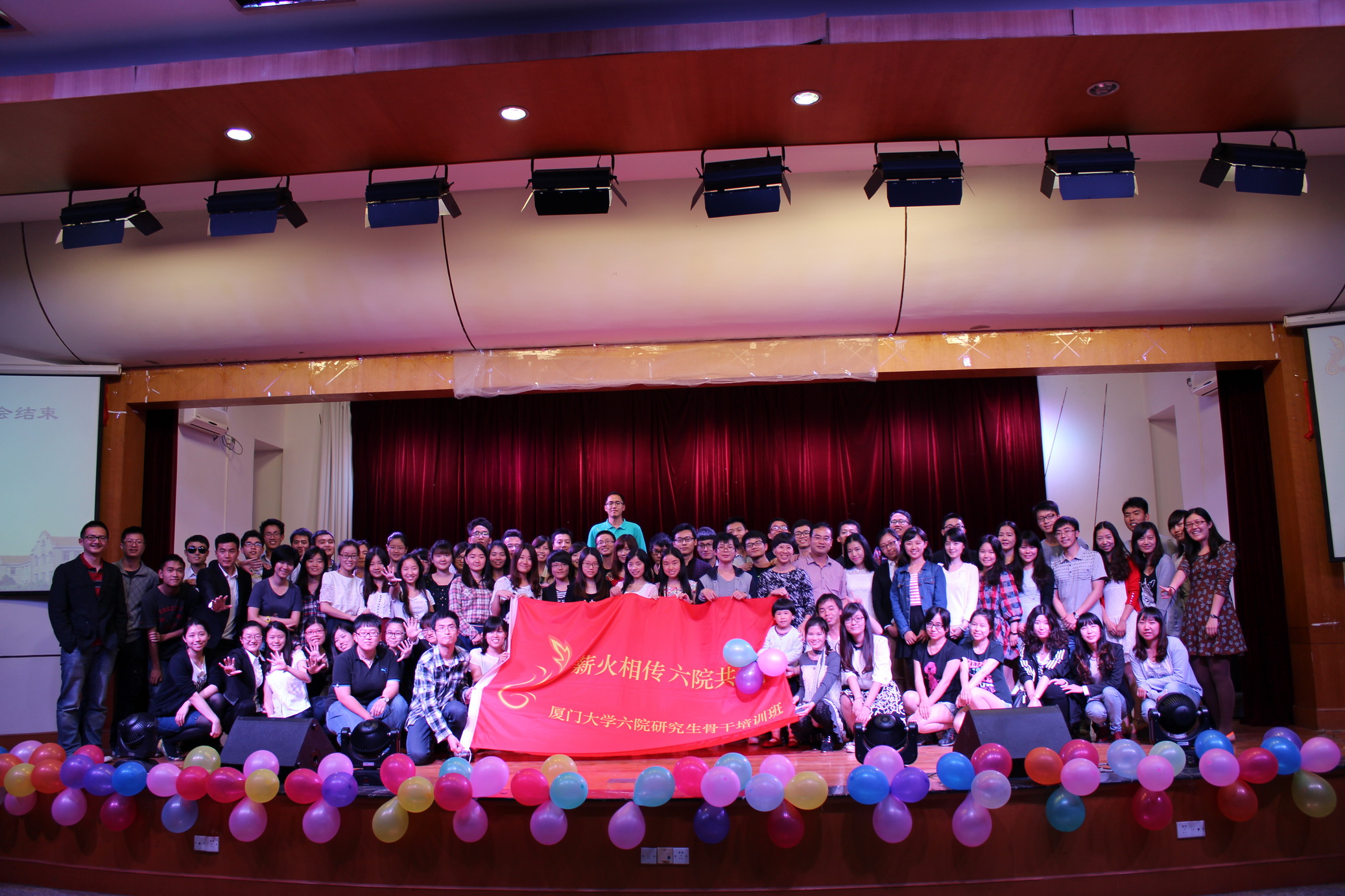 短短一个半月过去,六院干训班的同学迎来了结业告别的时刻。2014年4月20日晚7:00,由厦门大学人文学院研究生会、外文学院研究生会、法学院研究生会、物理与机电工程学院研究生会、建筑与土木工程学院研究生会以及国际关系学院/南洋研究院研究生会共同筹办的“薪火相传”六院研究生骨干培训班结业典礼暨晚会在法学院模拟法庭隆重举行。干训班全程得到了各院老师们的鼎力支持,各个学院的党委副书记、团委书记以及辅导员老师都受邀出席了结业典礼,与学员们共同见证这激动人心的时刻。
