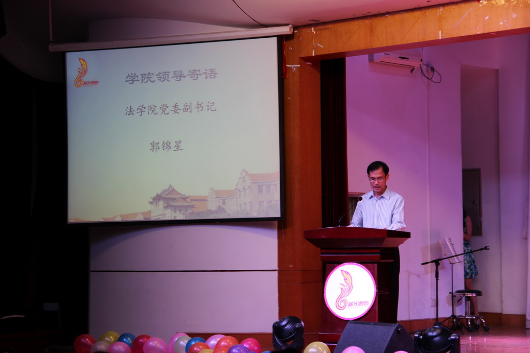 场外凉风习习,场内热火朝天。在一曲庄严的国歌之后,台上播放起“六院成长日记”视频,精彩的视频带学员们回顾了挥汗如雨的素质拓展、激烈纷呈的“一战到底”知识竞赛、飞舞青春的百人快闪、high翻全场的趣味运动会还有一场场生动晓畅的系列讲座,一幕幕携手合作、共同奋斗、共享欢乐的美好画面赢得了在场观众雷鸣般的掌声。来自法学院的汪雯同学作为学员代表在大会上发言,回顾了其个人在培训过程中的汗水与收获,道出了在场学员们的心声,同时也向一直以来支持本次培训的老师以及学子学姐表达了衷心的谢意。紧接着,法学院党委副书记郭锦星老师发表讲话,对本次培训班给予了高度评价。郭老师指出各个学院在进行学生干部培训的过程中难免受到条件的限制,本次培训采取六院联合的形式,活动内容极具多样化、创新性,做到了研究生干部培训工作的科学化、系统化和品牌化,全面提高了研究生骨干的综合素质。同时,老师也对在场的学员们寄予厚望,希望在未来学生工作中都能密切关注同学们的需求、打造创新学生活动、尽心完成学生工作。发言结束后,由在场的各位老师向学员们颁发了结业证书,并为表现突出的学员颁发了优秀学员奖状。