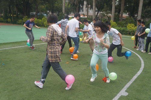 上午9时30分运动会正式开始,第一项比赛为“七人八足”,这个项目考验并锻炼各队队员们的协调性和默契度。紧接着就到了最精彩的项目“踩气球”。此项目分为团体赛和个人赛两个环节。第一环节中,团体对战,场面热闹非凡。同学们在场上你追我赶,奔跑跳跃。笑声伴着气球的爆炸声在上弦场奏出美丽的乐曲。在第二环节中,四支队伍的女中豪杰出场,她们使用“远交近攻,各个击破”的战略使比赛精彩万分。最终吴文文同学获得了此环节的个人奖—电风扇一台。最后一个项目是“拔河”,A、C两组对阵B、D两组,随着裁判一声哨响,双方队员都拼尽全力,经过一段时间的拉锯,B、D两组获得了最后的胜利。三项比赛结束后,B、D、C、A组分别获得此次趣味运动会的一、二、三、四名,每个人都得到了属于自己的奖品,当然,最重要的是:每个人都在团结协作中享受了一段欢乐时光。团委书记沈丽秀老师也来观看了趣味运动会,和同学们一起分享了欢乐。