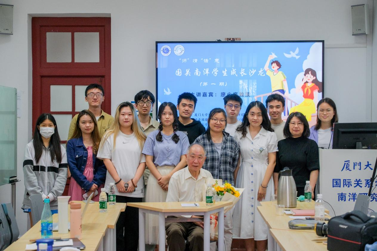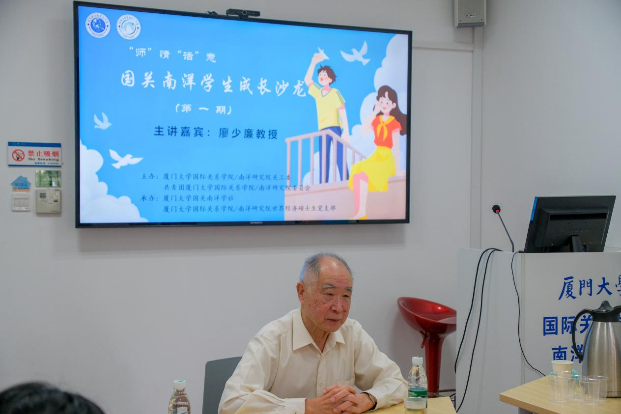 2024年4月29日上午,厦门大学国际关系学院/南洋研究院第一期“ ‘师’情 ‘话’意:国关南洋学生成长沙龙”活动在南安楼107顺利开展。本期邀请的主讲嘉宾是原厦门大学南洋研究所所长、世界经济学教授、博士生导师廖少廉老师。