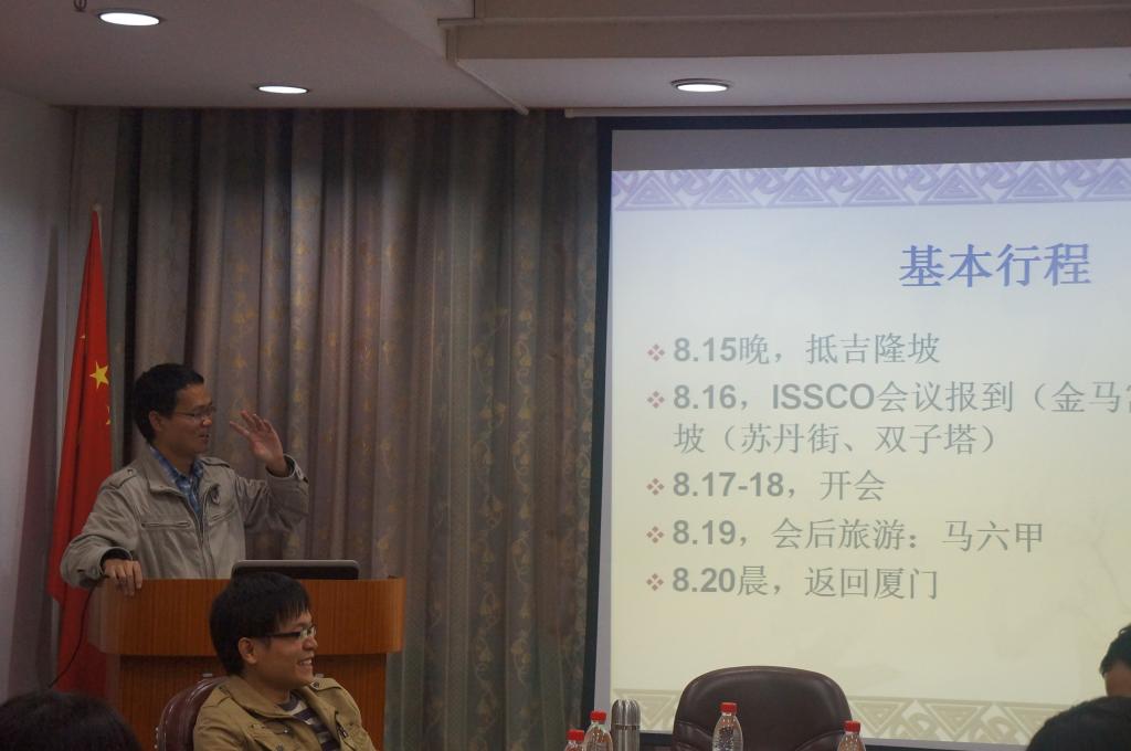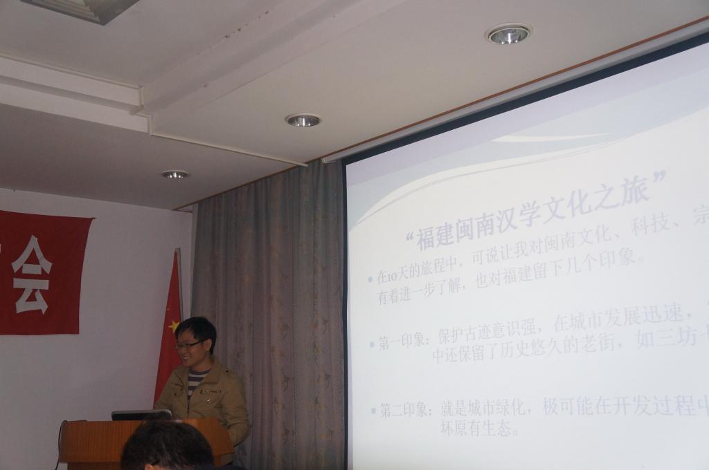 首先,王杨红博士向大家介绍了他们在会议期间的具体行程,接下来他又生动形象地讲解了他在ISSCO会议上的许多见闻。王杨红表示,许多学术界的泰斗级人物都出席了此次会议,在大会上,他不仅领略到了这些大师们在学术方面的高深造诣,还感受到了他们谦虚大气的人格魅力。接下来,目前在南洋研究院就读的马来西亚留学生阮湧啝博士跟大家分享了他的“福建闽南汉学文化之旅”。他说,在福建地区10天的行程让他对闽南的文化、科技、宗教等有了进一步的了解,而他在对这个行程的讲解过程中也让大家感受到了闽南汉学文化的独特魅力。分享会的最后一部分是自由提问,来自马来西亚的华人针对王杨红的讲解做了几点补充,也提出了不同的意见。研究生们也积极发表了自己关于马来西亚文化和闽南文化的看法。