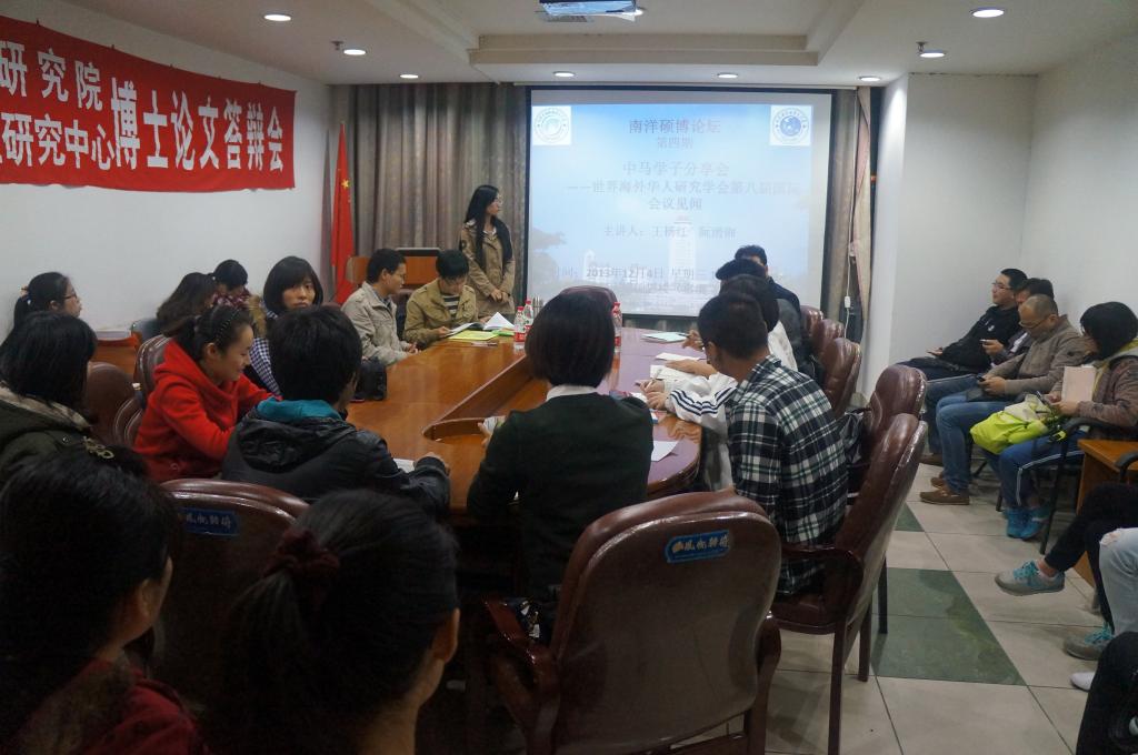 2013年12月4日晚上7点,由厦门大学国际关系学院暨南洋研究院博士生王杨红和阮湧啝主讲的“南洋纵横”之南洋硕博论坛第四期-中马学子分享会在颂恩楼1036会议室准时开始。会上两位博士生与大家分享了他们参加世界海外华人研究学会第八届国际会议的见闻,以及他们对中马不同文化的感悟和体会。