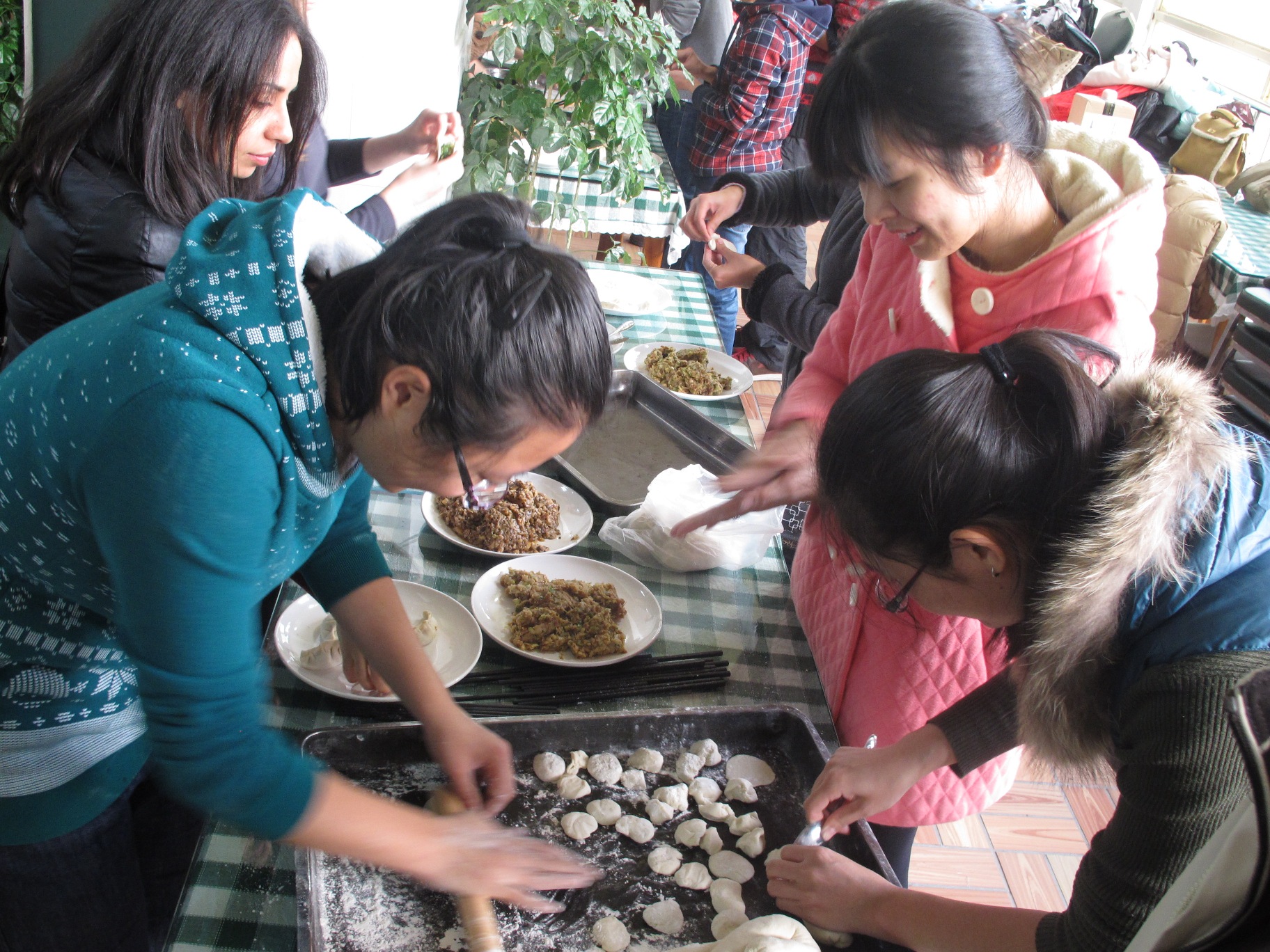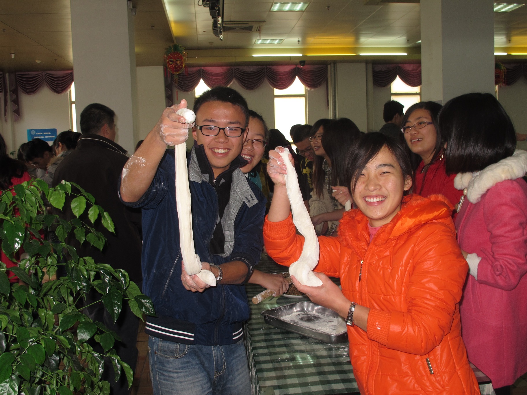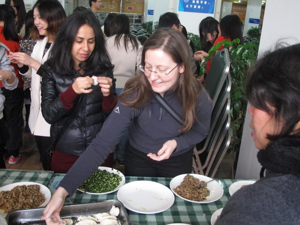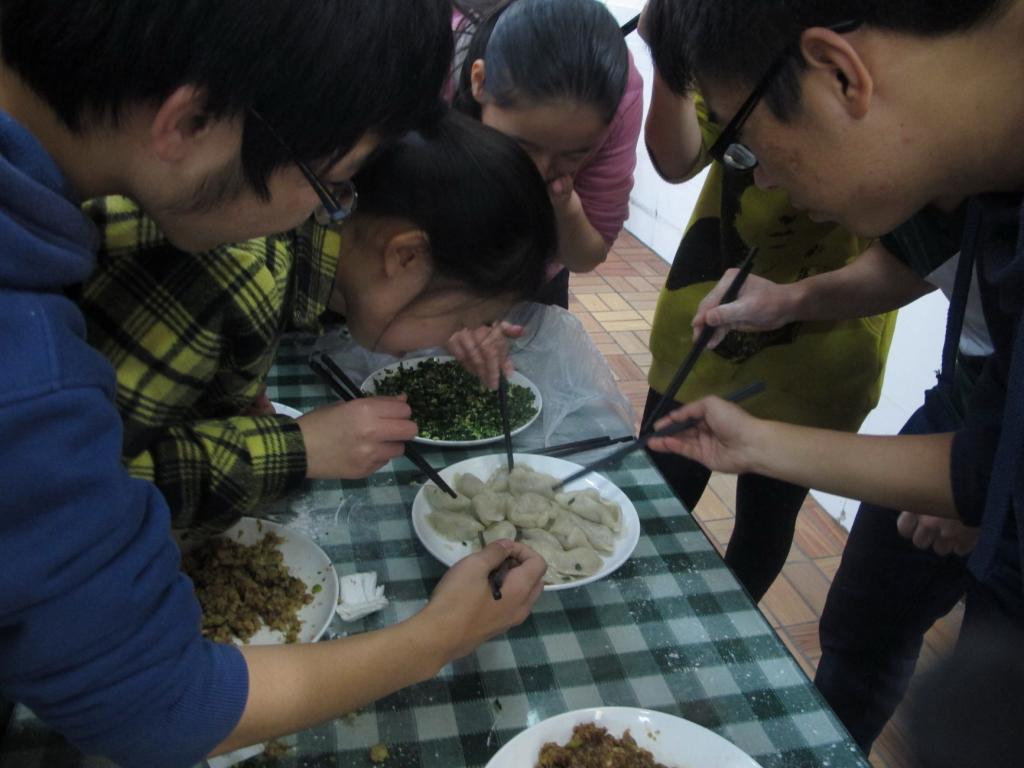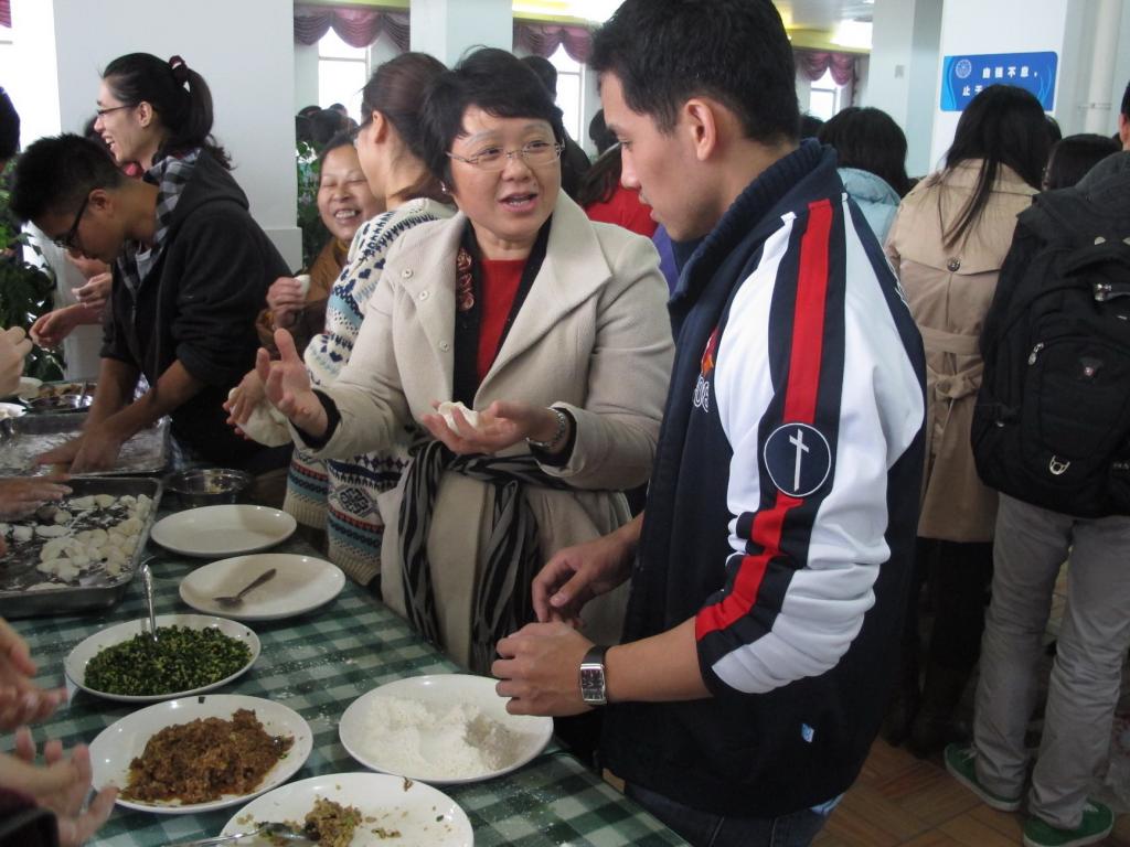 下午2时许,院学生会办公室的同学们就开始为饺子宴所需要的东西做准备了。15点30分左右,老师和同学们陆续来到凌云餐厅,冷清的大厅开始慢慢热闹起来。大家分工合作,你来拼桌子、我来端盘子、分馅料、切面团,配合默契、井然有序。一切准备就绪之后,大家分成几个小组开始包饺子。每个人都跃跃欲试,为数不多的擀面杖被一“抢”而空。院长庄国土、副院长施雪琴、党委副书记黄俊清等十几位老师也加入了同学们的行列,经验丰富的老师们细心地教同学们包饺子,有些从未包过饺子的同学学起来也有模有样,来自俄罗斯的美女研究生更是大显身手,包出来的饺子精致美观。参加饺子宴的还有很多来自日本、泰国、老挝等国家的国际生,包饺子有趣的过程和热闹氛围让他们也提前感受到了中国的“年味”。大家一边包,学姐们一边把包好的饺子收集起来拿到厨房去煮,不一会儿,分餐的窗口就被围得水泄不通,包好的饺子很快被大家一扫而光,即使是皮厚到像包子一样的饺子也被大家抢走津津有味地一起分享。整个餐厅的气氛就像饺子在沸腾的锅里翻滚一样,腾腾的热气和饺子的香味融化了每一颗心,家的温暖将大家紧紧包围。