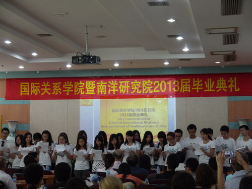 六月的凤凰花开迎来了离别的季节,几年的同窗们,今日即将挥手告别。2013年6月20日下午,国际关系学院/南洋研究院于颂恩楼220室举行了一场温馨、欢乐的毕业典礼,全院老师悉数参加,2013届本、硕、博、国际硕士、国际博士全体毕业生、部分毕业生家长以及学院其他年级学生代表也到场观礼,与全体毕业生一同欢庆。