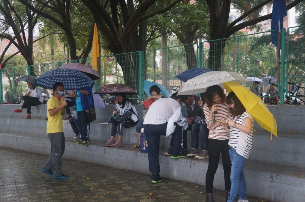 国际关系学院的同学们一早就打着伞来到演武场,为他们的同学加油助威!