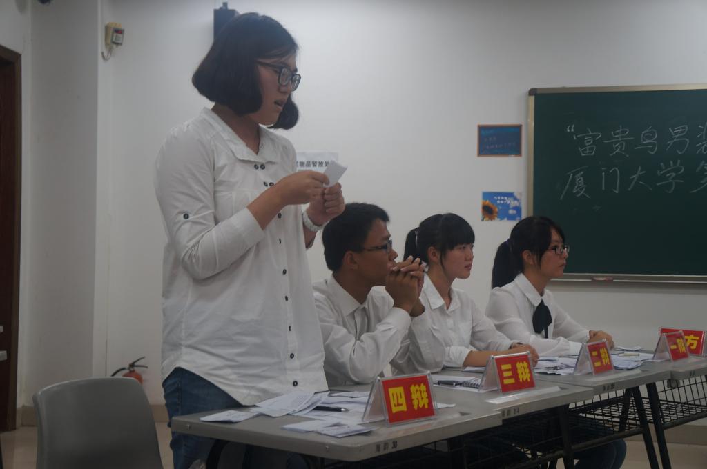 2013年11月3日下午4点30分,由厦门大学学生会主办的“富贵鸟男装杯”第十届厦门大学新生辩论赛周日第四场在海韵教学楼305室拉开了战幕。此场辩论赛辩题为“艺术商品化利大于弊还是弊大于利”。正方为国际关系学院,反方为外文学院。经过一个小时的激战,最终正方国际关系学院取得胜利,成功取得进入下一轮角逐的资格。