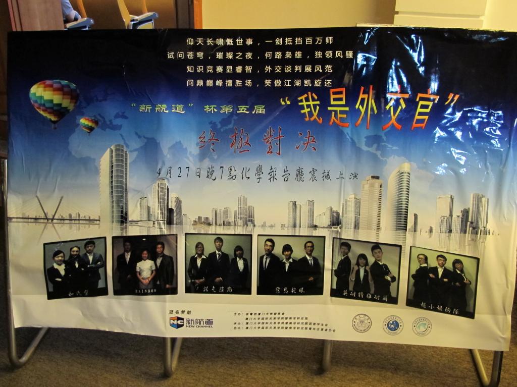 2013年4月27日晚7点,一场备受瞩目的视听盛宴——厦门大学“新航道杯”第五届“我是外交官”外交系列活动决赛在厦门大学本部化学报告厅隆重举行。本次活动由共青团厦门大学委员会和厦门大学国际关系学院/南洋研究院主办,副院长李一平、国际关系系主任赵海立、侨务与外交系主任王望波、原副院长林梅、11级班主任黄飞等老师担任决赛评委,厦门大学校学生组织秘书长周林琪、国际关系学院/南洋研究院党委副书记黄俊清、团委书记沈丽秀及来自各院系的近二百名同学参加了该活动。