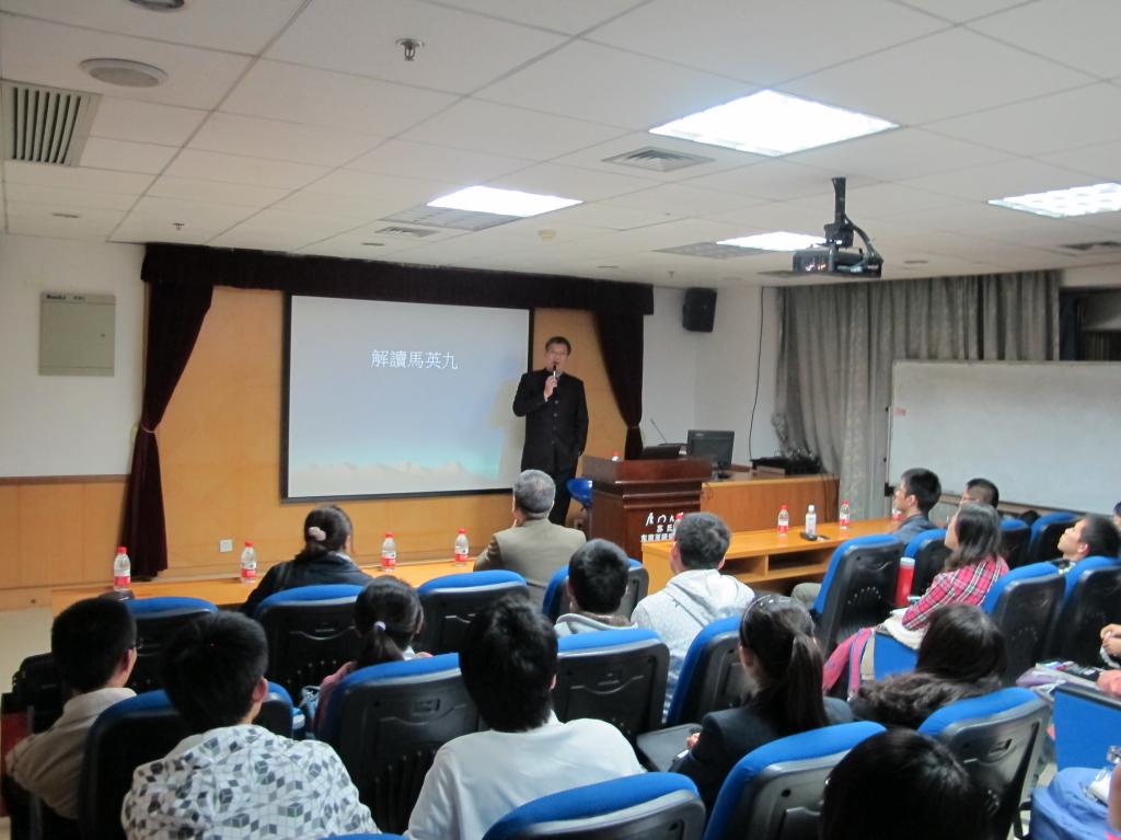 2012年12月19日晚上7点,国际关系学院/南洋研究院博士研究生游鸿程在颂恩楼(嘉庚三)514为我院师生做了一场解读台湾领导人马英九的讲座,吸引了院内外大批同学。