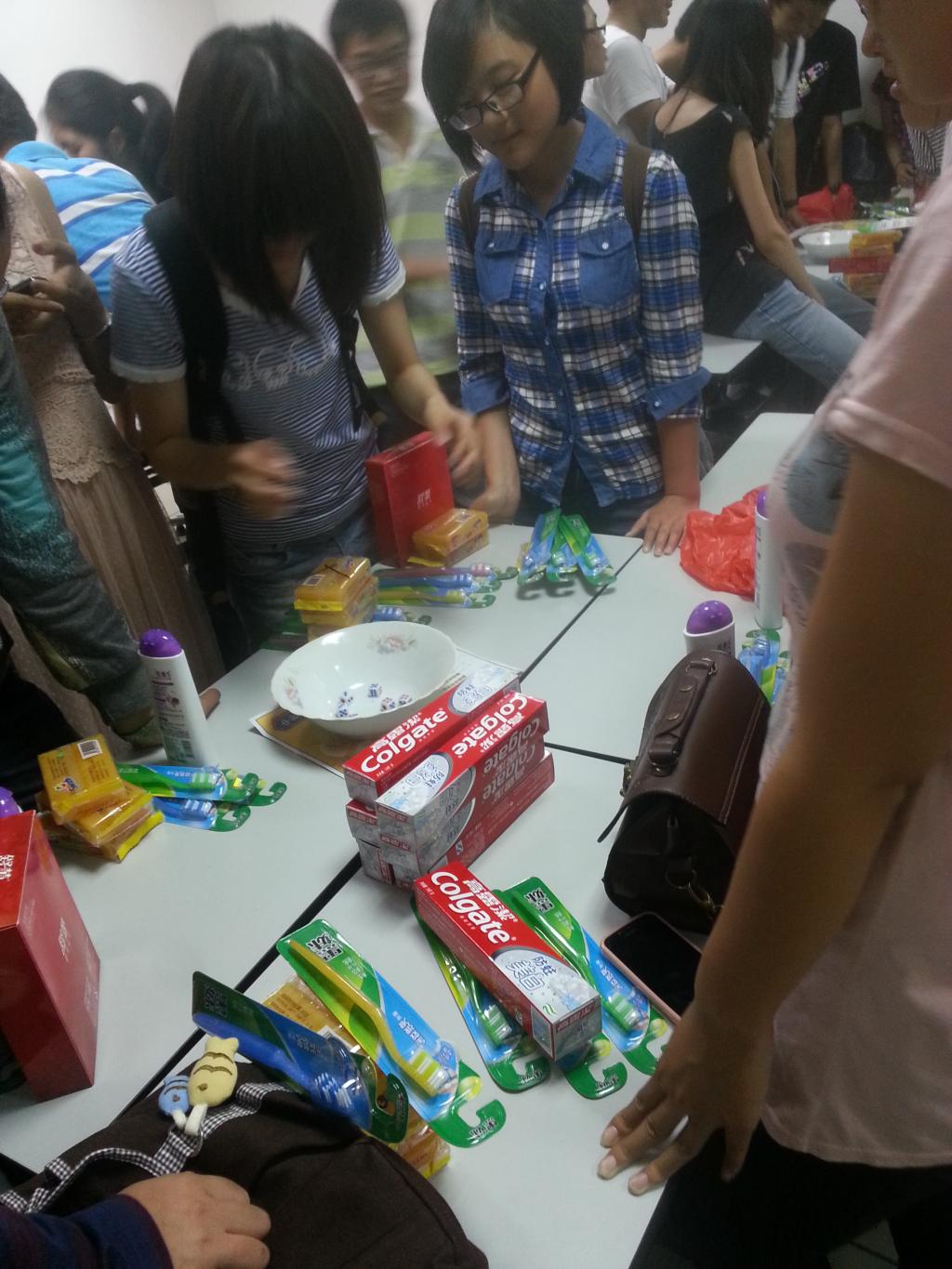 开始的时间还没有到,同学们便已陆续到达活动教室。只见场地已经安排就绪,博饼道具一应俱全。每张方桌上还摆放着牙膏、牙刷、肥皂、洗发水等实用的生活物品,原来这是学院特别出资为新生准备的丰厚奖品。