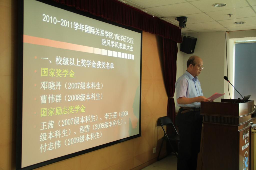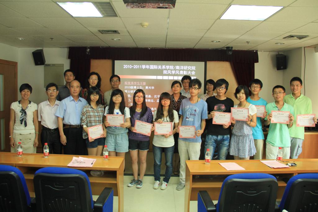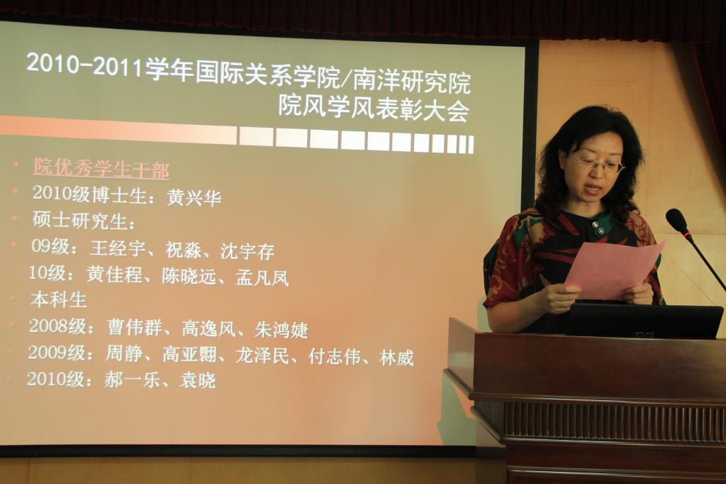 6月10日下午3点,国际关系学院/南洋研究院2010-2011学年院风学风表彰大会暨暑期社会实践动员大会在颂恩楼514会议室隆重举行。院长庄国土,党总支书记范丽,副院长聂德宁、林梅,党总支副书记黄俊清,郭玉聪教授,团委书记沈丽秀及学院百余名学生代表出席大会,会议由学生会主席曹伟群同学主持。