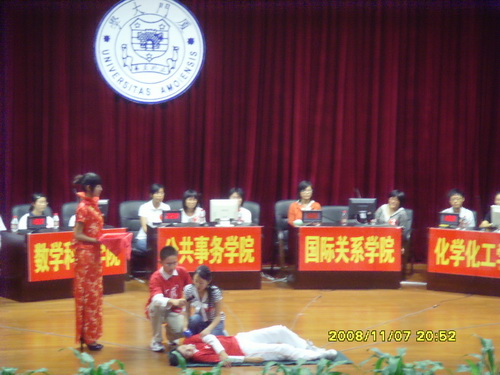 经过预赛的激烈的角逐,我院与公共事务学院、数学科学学院、化学化工学院、建筑与土木工程学院及法学院六学院从19个学院队伍中以均分第二的优异成绩脱颖而出,顺利晋级决赛。代表我院参加此次知识竞赛决赛的是08级的高逸风、李王蓓和叶译韩三名同学。比赛中,三名同学喊出了“世界巅峰有我们的位置”这一响亮口号,在各个环节都有不俗的表现。其中,高逸风同学在“神医就是你”的实践题中的耐心示范与详细讲解,叶译韩同学在抢答题环节的精彩回答,李王蓓同学在“你方唱罢我登场”的必答题中的严谨斟酌均给观众们留下深刻的印象。同时,我院观众席的拉拉队也在比赛中高举“南强国关,非同一般”的横幅,为三名同学呐喊助威。