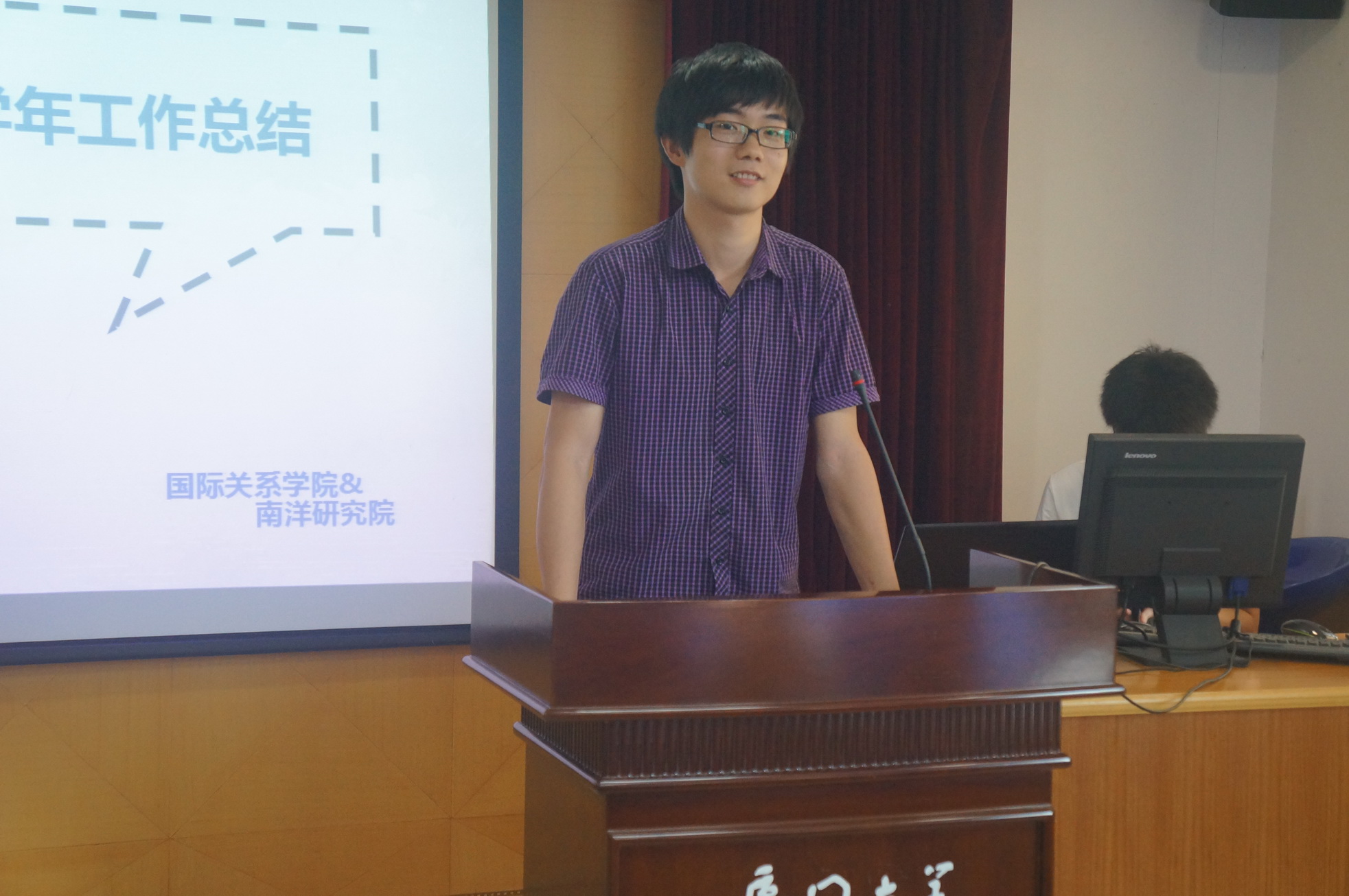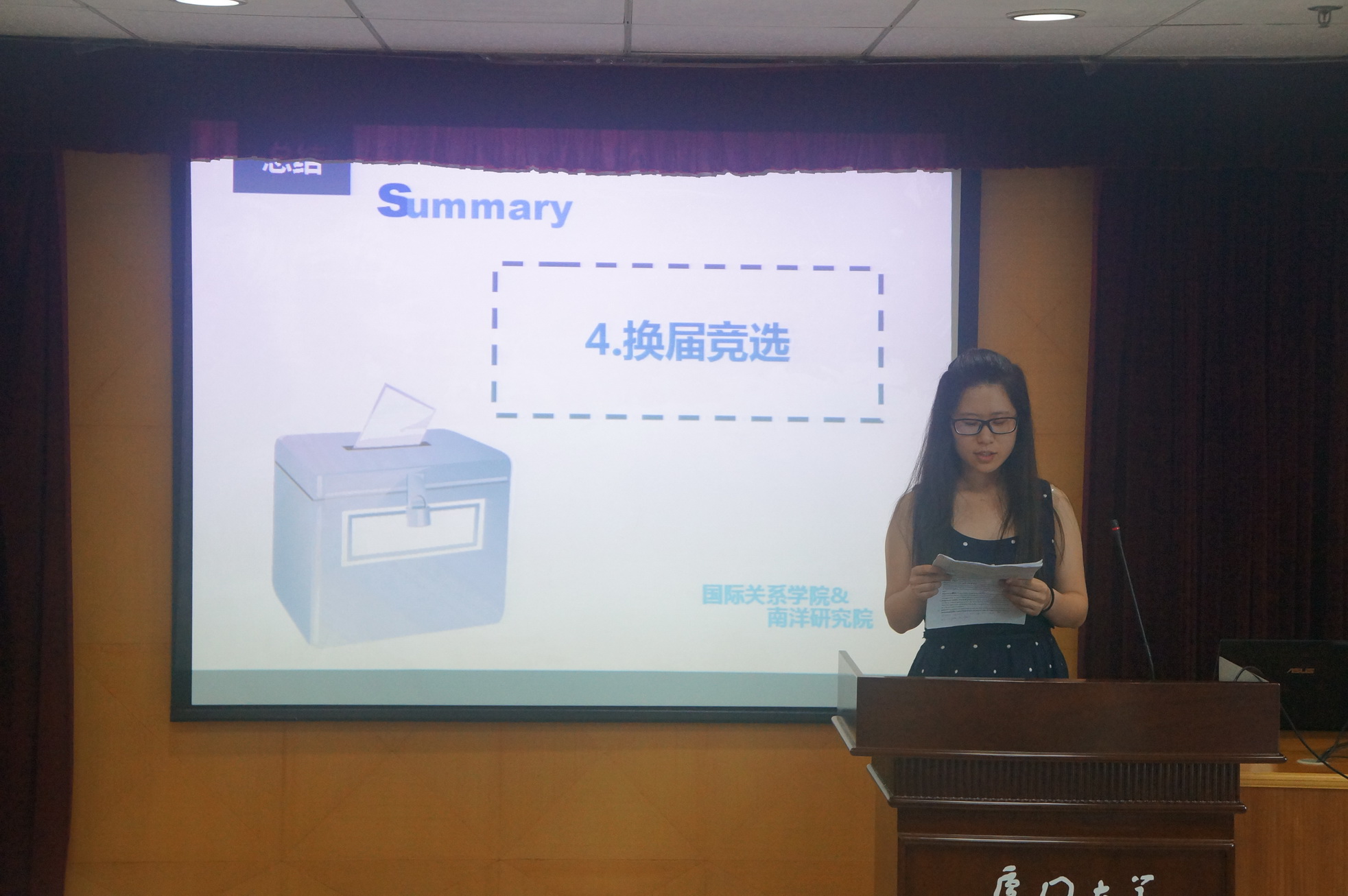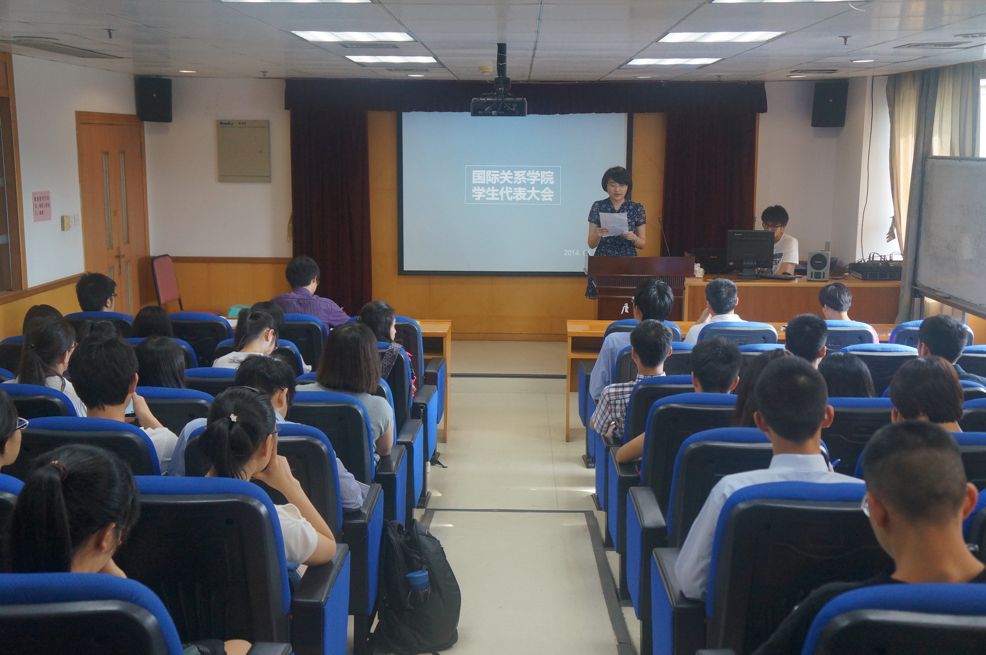 2014年6月20日下午16时30分,厦门大学国际关系学院学生代表大会在颂恩楼514会议室准时召开。院党委副书记黄俊清老师、院团委书记沈丽秀老师出席了本次大会。会议由第五届学院本科生团总支副书记肖琳琳主持。