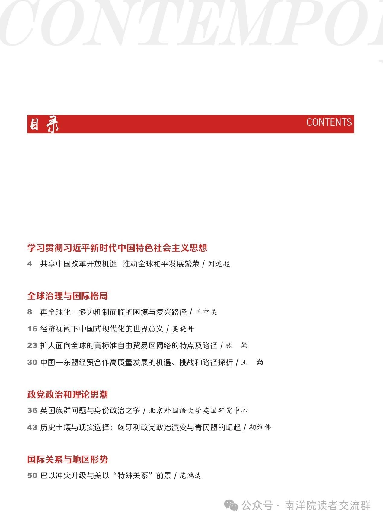 厦门大学国际关系学院/南洋研究院教授王勤新作《中国—东盟经贸合作高质量发展的机遇、挑战和路径探析》在《当代世界》2024年第12期正式刊出。该文是教育部人文社会科学重点研究基地重大项目“‘印太经济框架’的发展态势、影响及我国的应对策略研究”(项目批准号:22JJD790043)的阶段性研究成果。