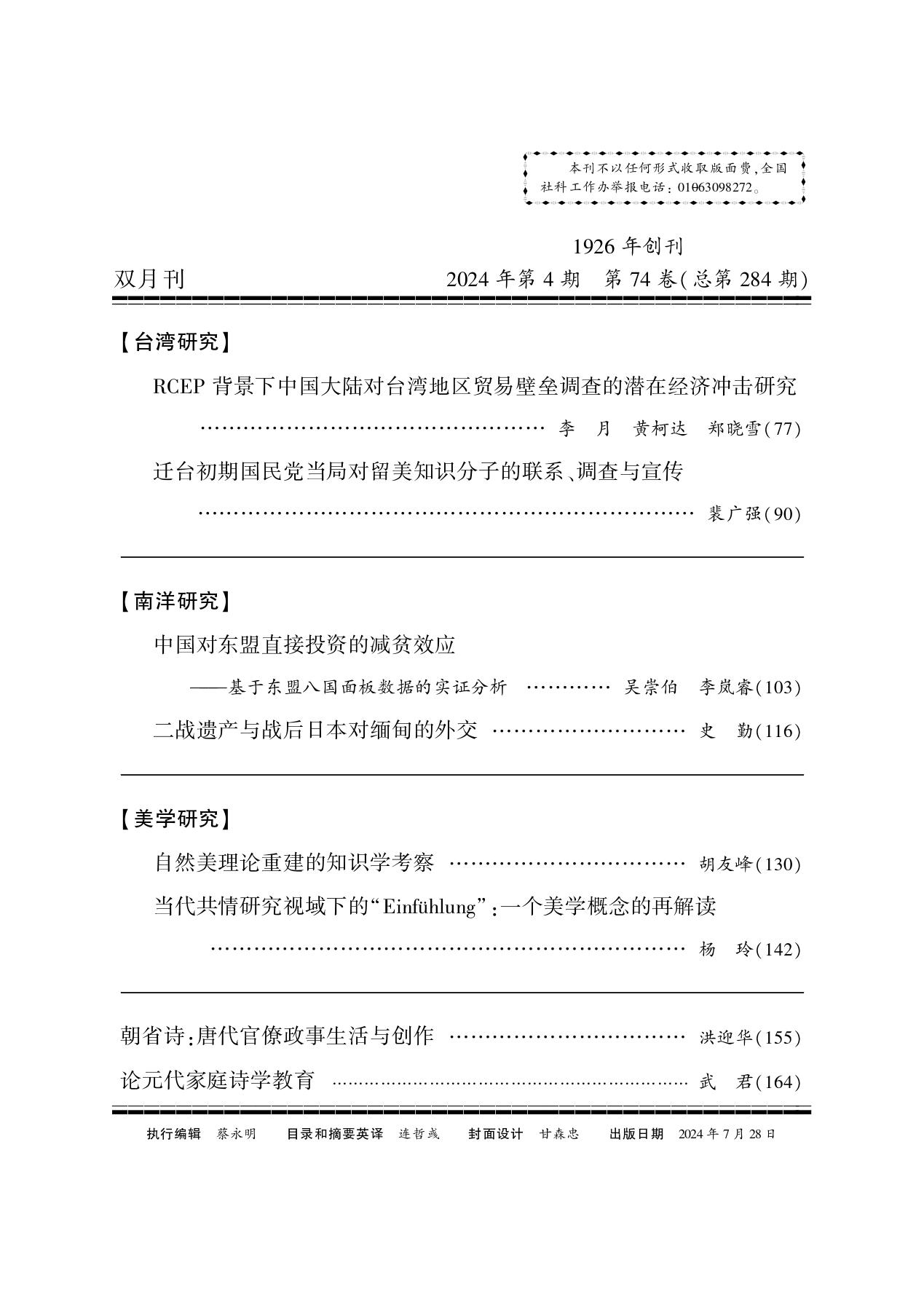 厦门大学国际关系学院/南洋研究院教授吴崇伯、博士生李岚睿新作《中国对东盟直接投资的减贫效应——基于东盟八国面板数据的实证分析》在《厦门大学学报(哲学社会科学版)》2024年第4期正式刊出。