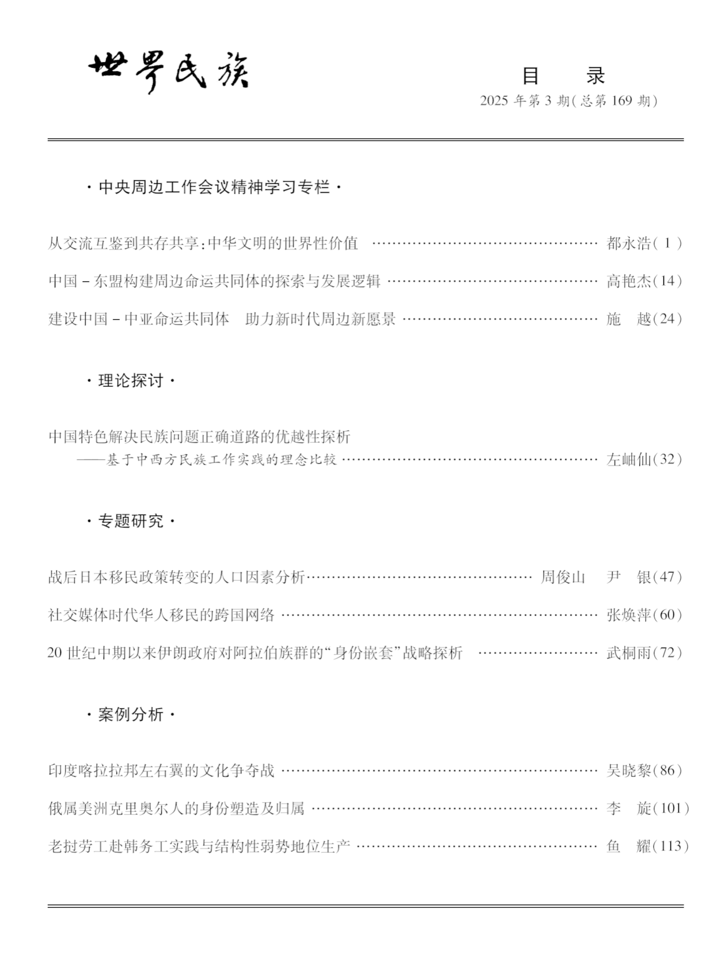 厦门大学国际关系学院/南洋研究院高艳杰教授新作《中国—东盟构建周边命运共同体的探索与发展逻辑》在《世界民族》2025年第3期正式刊出,该文是教育部人文社会科学重点研究基地重大项目“美国政府对东盟认知的历史嬗变及其对印太战略的影响研究”(22JSJD810019)的阶段性成果。