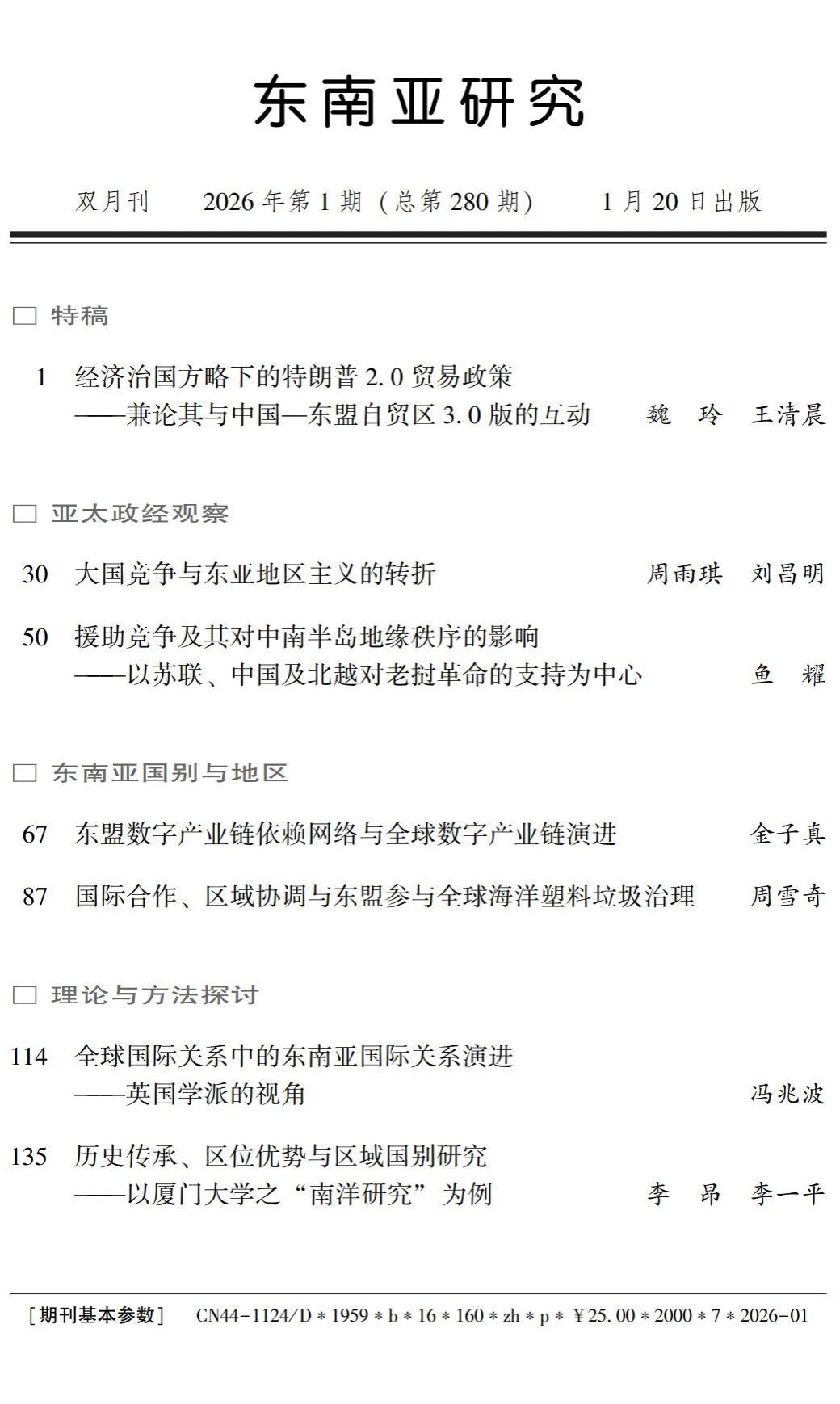 厦门大学国际关系学院/南洋研究院2022级博士生李昂与李一平教授在《东南亚研究》2026年第1期发表论文《历史传承、区位优势与区域国别研究——以厦门大学之“南洋研究”为例》,该文为教育部人文社科重点研究基地重大项目“中美战略竞争下东南亚地缘政治发展研究”阶段性成果。