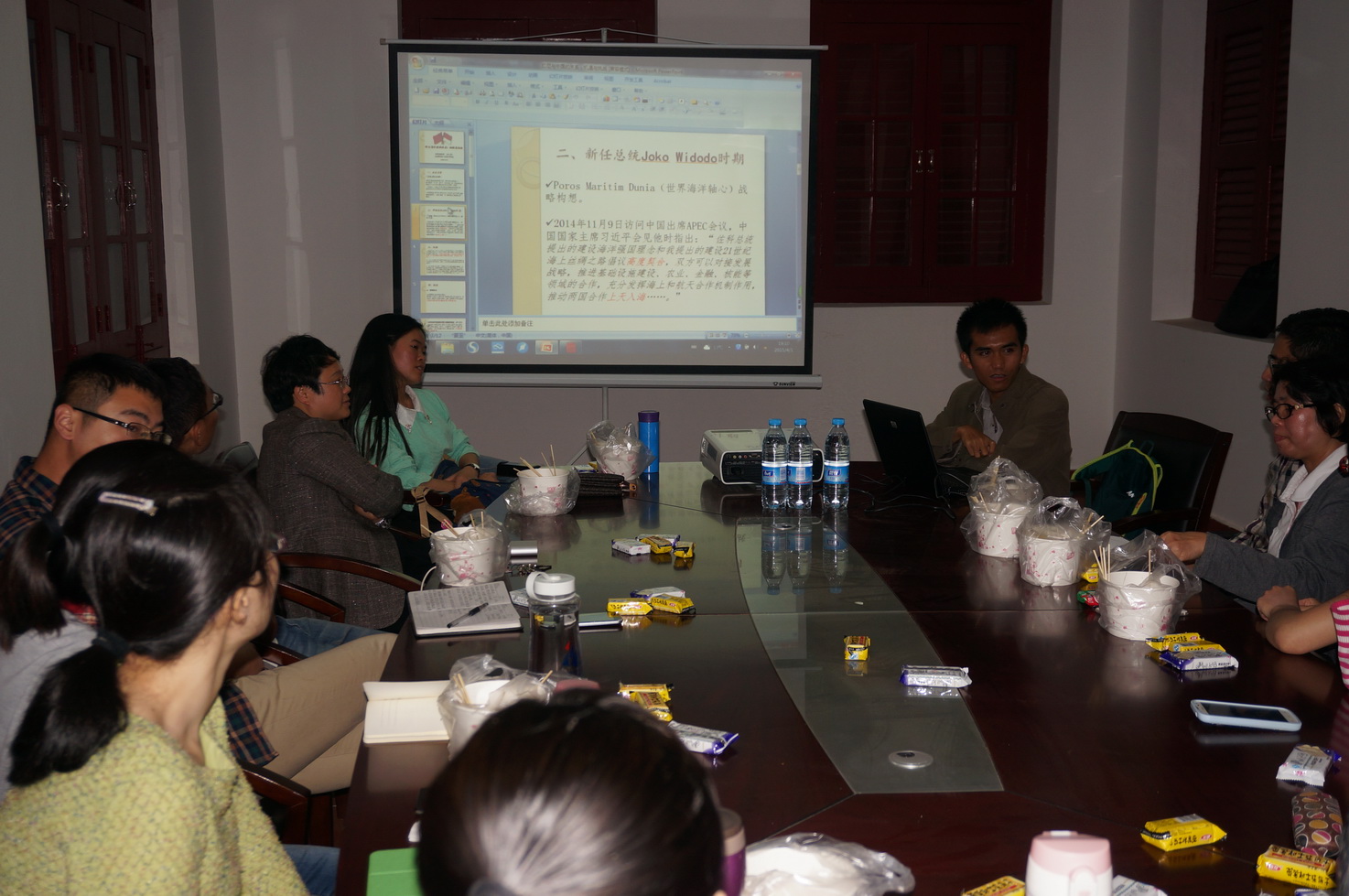 为加强中外学子之间的交流,增进同学们之间的友谊,2015年4月1日周三晚上在南安楼309会议室,由厦门大学国际关系学院暨南洋研究院研究生会举办了一场南洋硕博论坛——中外学子交流会活动。此次中外学子交流会系属印尼专场,特邀我院印尼籍学生2013级国际关系博士米拉、吉瑞明、2013级国际关系硕士王小明来为同学们做演讲。参与此次活动的有我院副院长施雪琴教授以及我院中外硕博生共30多人。