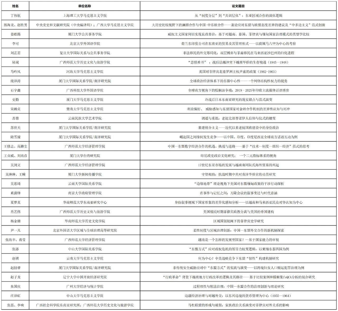 自2025年8月6日《“演进中的东南亚区域主义:第二届东盟研究中青年学者论坛”征文启事(第一号通知)》发布以来,论坛得到了东南亚学界同仁的关注与支持。在广大中青年学者的热情参与下,本次征文工作已顺利完成。根据论坛规模及主题限定,经过严格匿名评审遴选,同时秉承支持博士生成长的精神,共确定32篇论文入选本次论坛,现将名单予以公布(按作者姓名拼音排序,论文标题与来稿标题一致)。