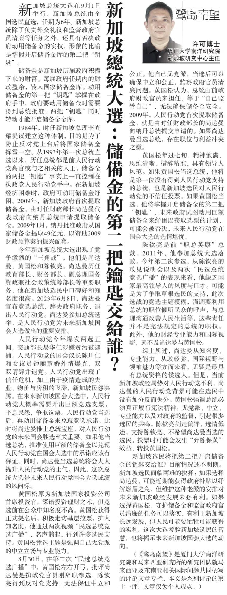 新加坡总统大选即将在9月1日举行。新加坡总统由全国选民直选,任期为6年。新加坡总统除了负责外交礼仪和监督政府官员清廉等任务之外,还具有否决政府动用储备金的实权,形象的比喻是掌握开启储备金库的第二把“钥匙”。储备金是新加坡历届政府积攒下来的财富。每届政府任期内的财政盈余,转入国家储备金库。动用储备金的第一把“钥匙”掌握在政府手中,政府要动用储备金时需要得到总统批准,两把“钥匙”同时转动才能开启储备金金库。1984年,时任新加坡总理李光耀提议建立这种体制,目的是为了防止反对党上台后将国家储备金挥霍一空。从1993年第一次总统直选以来,历任总统都是前人民行动党高官或与之相关的人士,储备金的两把“钥匙”事实上一直控制在执政党人民行动党手中。在新加坡经济困难时,政府可动用储备金纾困。2009年,新加坡政府首次提取储备金,由时任财政部长尚达曼代表政府向纳丹总统申请提取储备金。2009年1月,纳丹批准政府从国家储备金提取49亿元,以资助2009财政预算案的振兴配套。