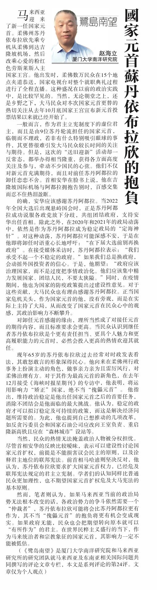 当然,民众的热情无法掩盖政治人物被分权担忧。尽管首相安华的反映比较暧昧,表示可以建设性讨论国家元首扩权,前提是不能损害议会民主的原则,以及诠释君主地位的联邦宪法。前首相马哈迪则坚决反对,他认为,苏丹依布拉欣要求扩大国家元首权力,已经危及联邦宪法规定的君主立宪制。学者们的认知同样比普通民众更加理性,也不期望国家元首扩权危及大马宪法的基本原则。