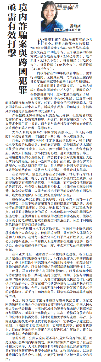 总的来说,公共安全问题不再只是大马自身的问题,而是区域社会共同面临的挑战。频繁的诈骗案严重冲击了社会信任和公共秩序,大马对跨国犯罪治理的紧迫性已经逼在眉睫,只有通过重新审视公共安全战略布局、加强国内执法,以及提升跨国联合执法合作机制,才能更好地维护区域公共安全和秩序。