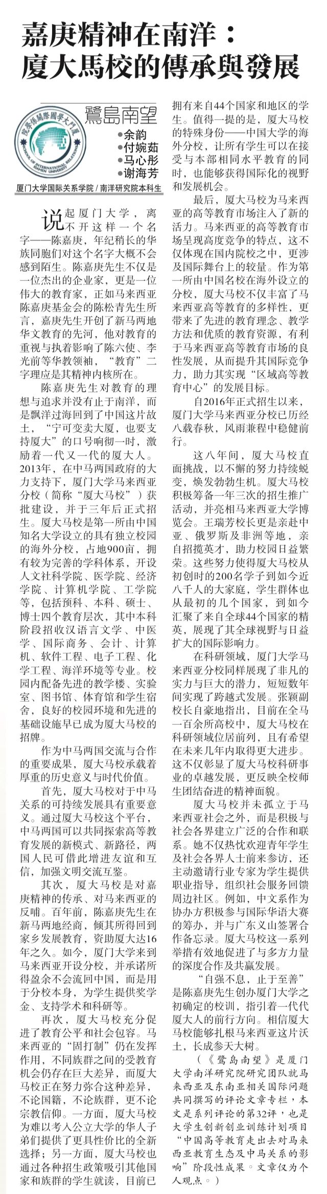 其次,厦大马校是对嘉庚精神的传承、对马来西亚的反哺。百年前,陈嘉庚先生在新马两地经商,倾其所得回到家乡发展教育,资助厦大达16年之久。如今,厦门大学来到马来西亚开设分校,并承诺所得盈余不会流回中国,而是用于分校本身,为学生提供奖学金、支持学术和科研等。