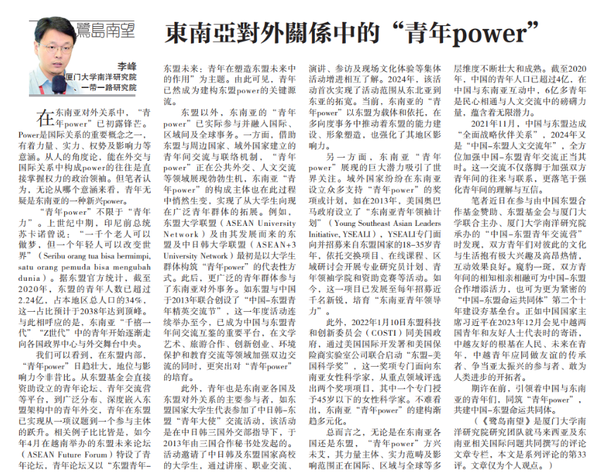 笔者近日在参与由中国东盟合作基金赞助、东盟基金会与厦门大学联合主办、厦门大学南洋研究院承办的“中国-东盟青年交流营”时发现,双方青年们对彼此的文化与生活抱有极大兴趣与高昂热情,互动效果良好。窥豹一斑,双方青年间的相知相亲相融可为中国-东盟合作增添活力,也可为更为紧密的“中国-东盟命运共同体”第二个十年建设夯基垒台。正如中国国家主席习近平在2023年12月会见中越两国青年和友好人士代表时的寄语,中越友好的根基在人民、未来在青年,中越青年应同做友谊的传承者、争当亚太振兴的参与者、敢为人类进步的开拓者。