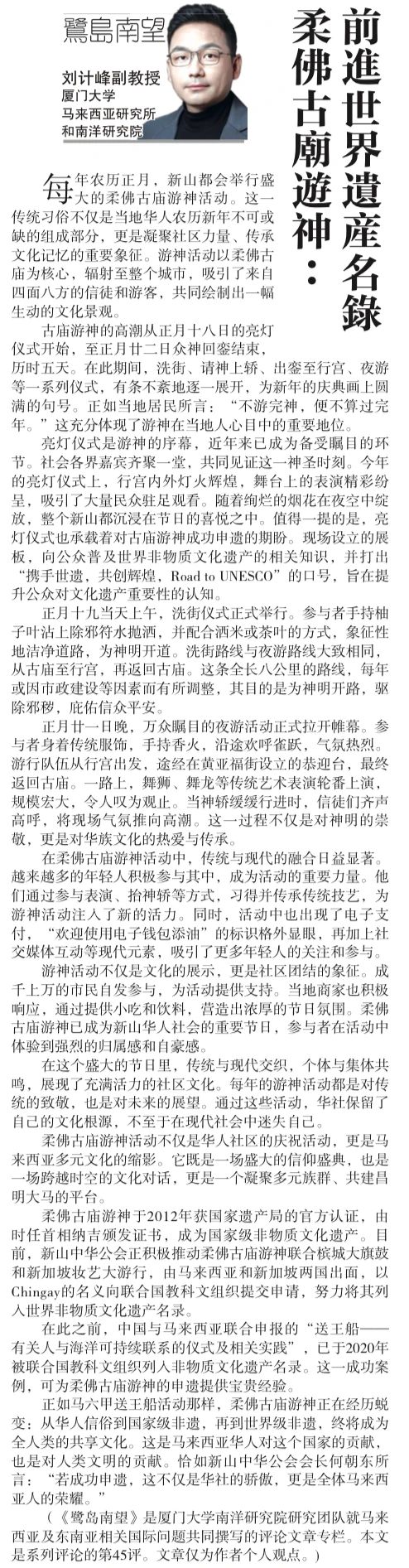 在此之前,中国与马来西亚联合申报的“送王船——有关人与海洋可持续联系的仪式及相关实践”,已于2020年被联合国教科文组织列入非物质文化遗产名录。这一成功案例,可为柔佛古庙游神的申遗提供宝贵经验。