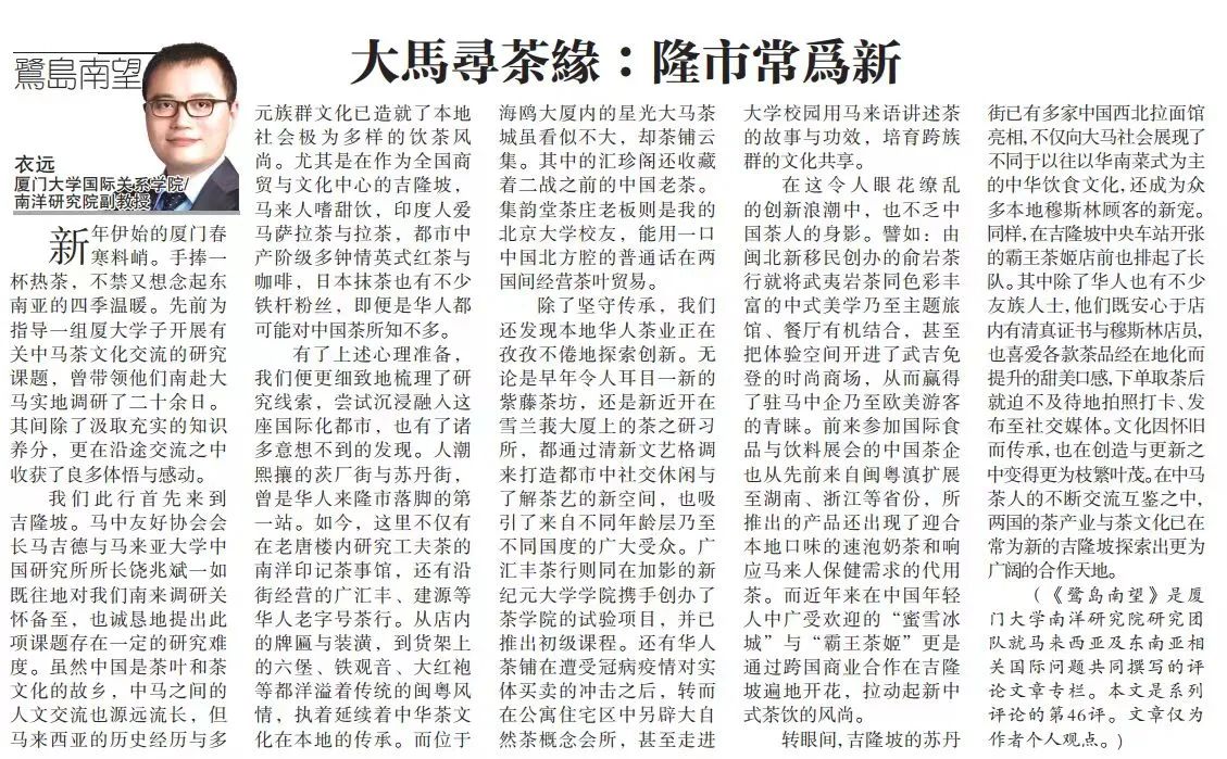 新年伊始的厦门春寒料峭。手捧一杯热茶,不禁又想念起东南亚的四季温暖。先前为指导一组厦大学子开展有关中马茶文化交流的研究课题,曾带领他们南赴大马实地调研了二十余日。其间除了汲取充实的知识养分,更沿途交流之中收获了良多体悟与感动。