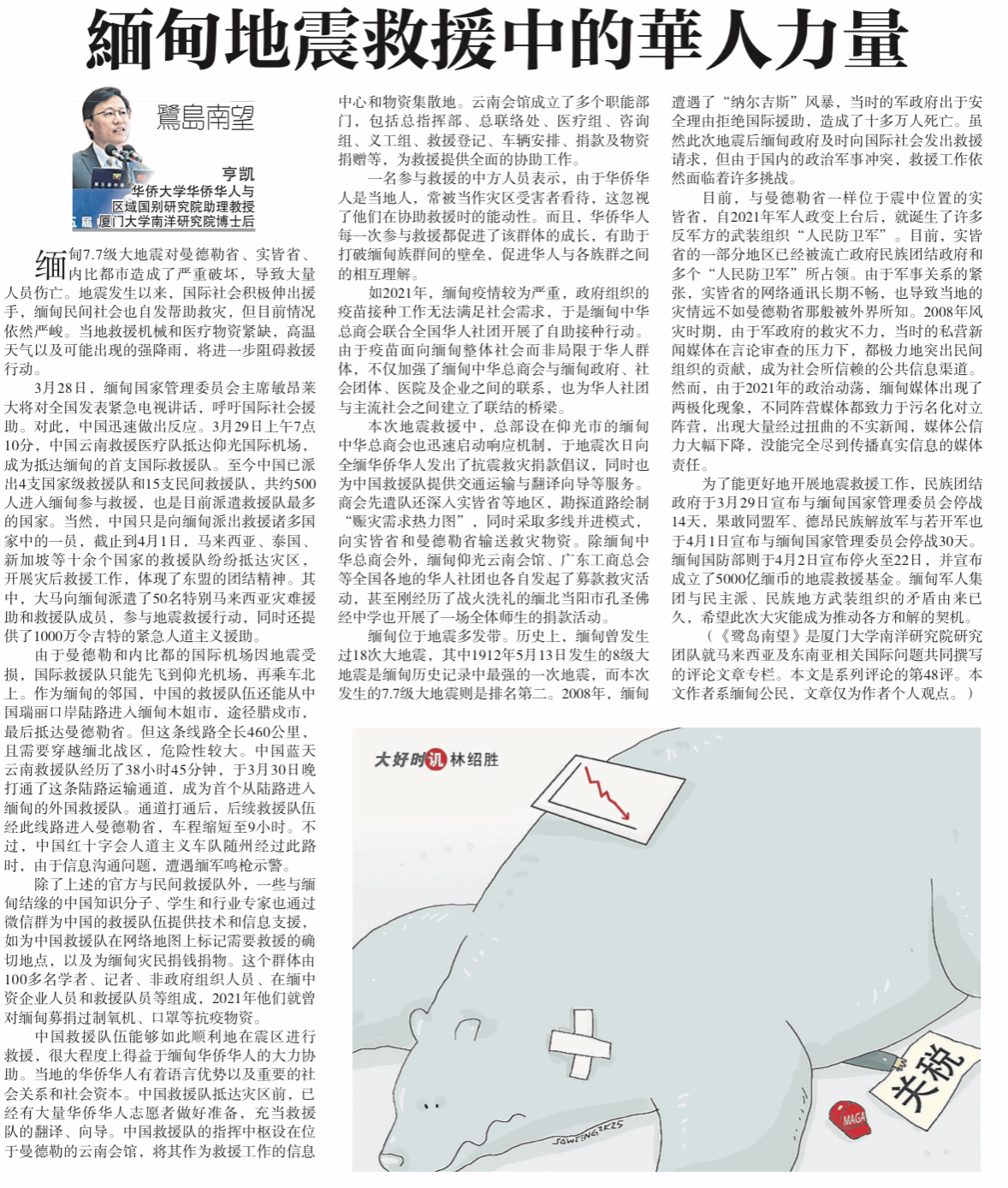 缅甸7.7级大地震对曼德勒省、实皆省、内比都市造成了严重破坏,导致大量人员伤亡。地震发生以来,国际社会积极伸出援手,缅甸民间社会也自发帮助救灾,但目前情况依然严峻。当地救援机械和医疗物资紧缺,高温天气以及可能出现的强降雨,将进一步阻碍救援行动。