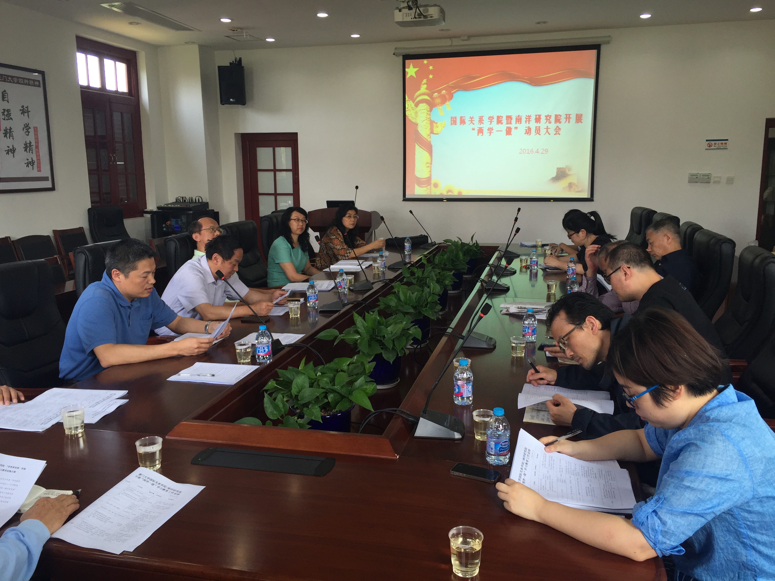 4月29日下午,国际关系学院/南洋研究院党委在南安楼301(3)召开“两学一做”学习教育动员部署会。厦门大学“两学一做”学习教育第二督导组组长、校统战部部长梁卫中,学院党委书记范丽,党委副书记黄俊清,学院党委委员和各党支部书记、支部委员及党务秘书参加此次大会,大会由学院院长李一平主持。