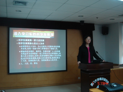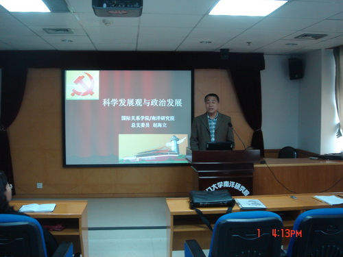 4月1日下午3:00,国际关系学院/南洋研究院的第二场专题讲座——科学发展观与政治发展,在颂恩楼514会议室举行,此次讲座的主讲人为我院总支委员赵海立副教授,由学院党总支范丽书记主持,全体教师党员、学生党员参加了此次讲座,也吸引了外院师生前来听讲。