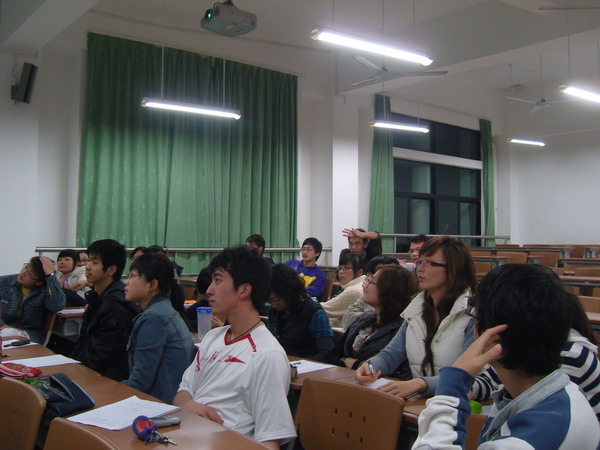 首先,包婉颖同学向大家简述了实践科学发展观的时代背景及科学内涵,详细介绍了近期我班将围绕这一主题展开一系列团课活动。其中的问答环节中,三组同学均表现踊跃,在轻松愉悦的氛围中温习了党团基本知识。在如何在日常生活中积极实践科学发展观这一激烈讨论中,同学们普遍呼吁应由身边小事做起,如节水节电等,为构建文明和谐的校园环境而做出不懈努力。