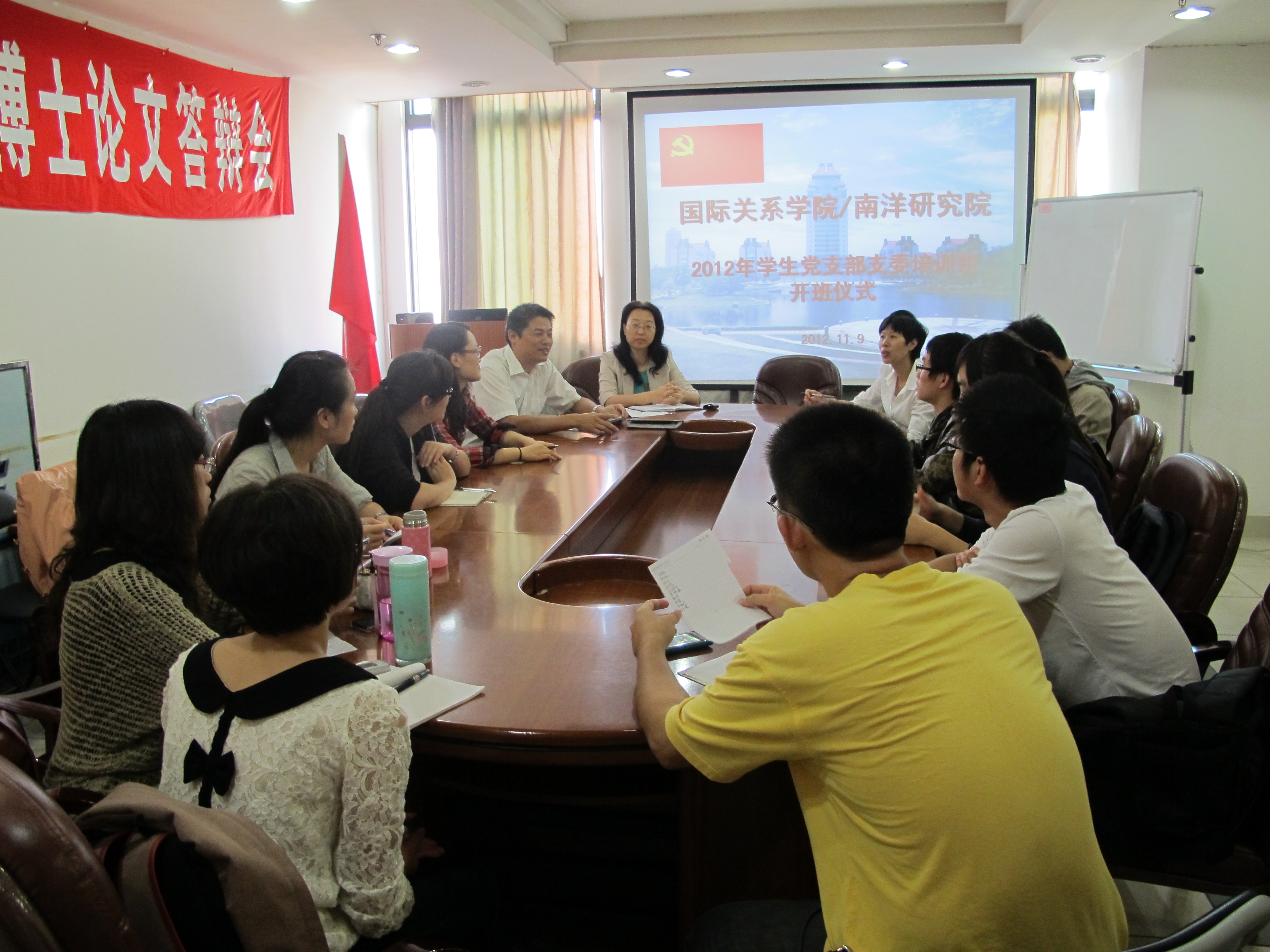 11月9日上午8:00,伴随着庄严的国际歌的奏响,国际关系学院/南洋研究院2012-2013学年学生支委培训班开班仪式暨第一次培训在颂恩楼1036会议室如期召开。出席活动的有我院党总支书记范丽、党总支副书记黄俊清、院团委书记沈丽秀、党务秘书姚晓静以及各年级学生支委。开班仪式由副书记黄俊清主持。
