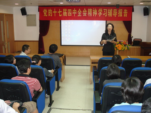 学院党总支书记范丽老师主持了本次报告会,并就我院如何深入开展学习贯彻落实党的十七届四中全会精神作了工作部署。范丽要求学院各党支部认真贯彻落实十七届四中全会精神,全体党员、积极分子要在原原本本学习党的十七届四中全会精神的基础上,通过多样的形式,学习讨论、深化理解。她强调,每位党员、积极分子在学习的过程中,要注重理论联系实际,提高理论水平,为促进学院各项工作的发展做出贡献。党总支、各支部要在加强自身建设上勇于创新和实践,为学院事业发展提供思想和组织保证,也为推动学院党建工作的发展作努力,从而推动党的伟大事业的发展。