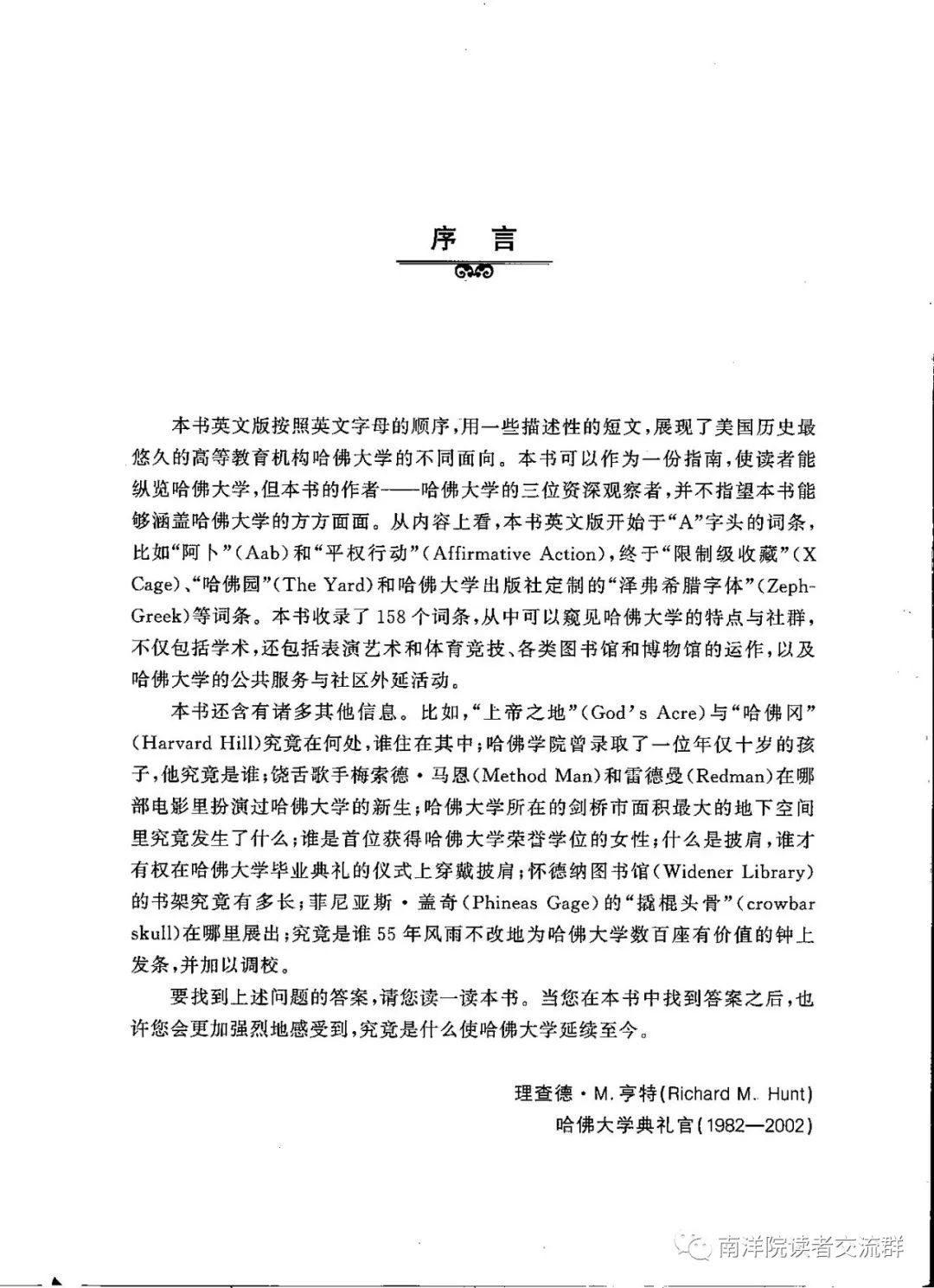 理查德·M.亨特,1960年毕业于哈佛大学,获得历史学博士学位,曾任哈佛大学典礼官(1982—2002)、哈佛大学文理研究生院副院长。